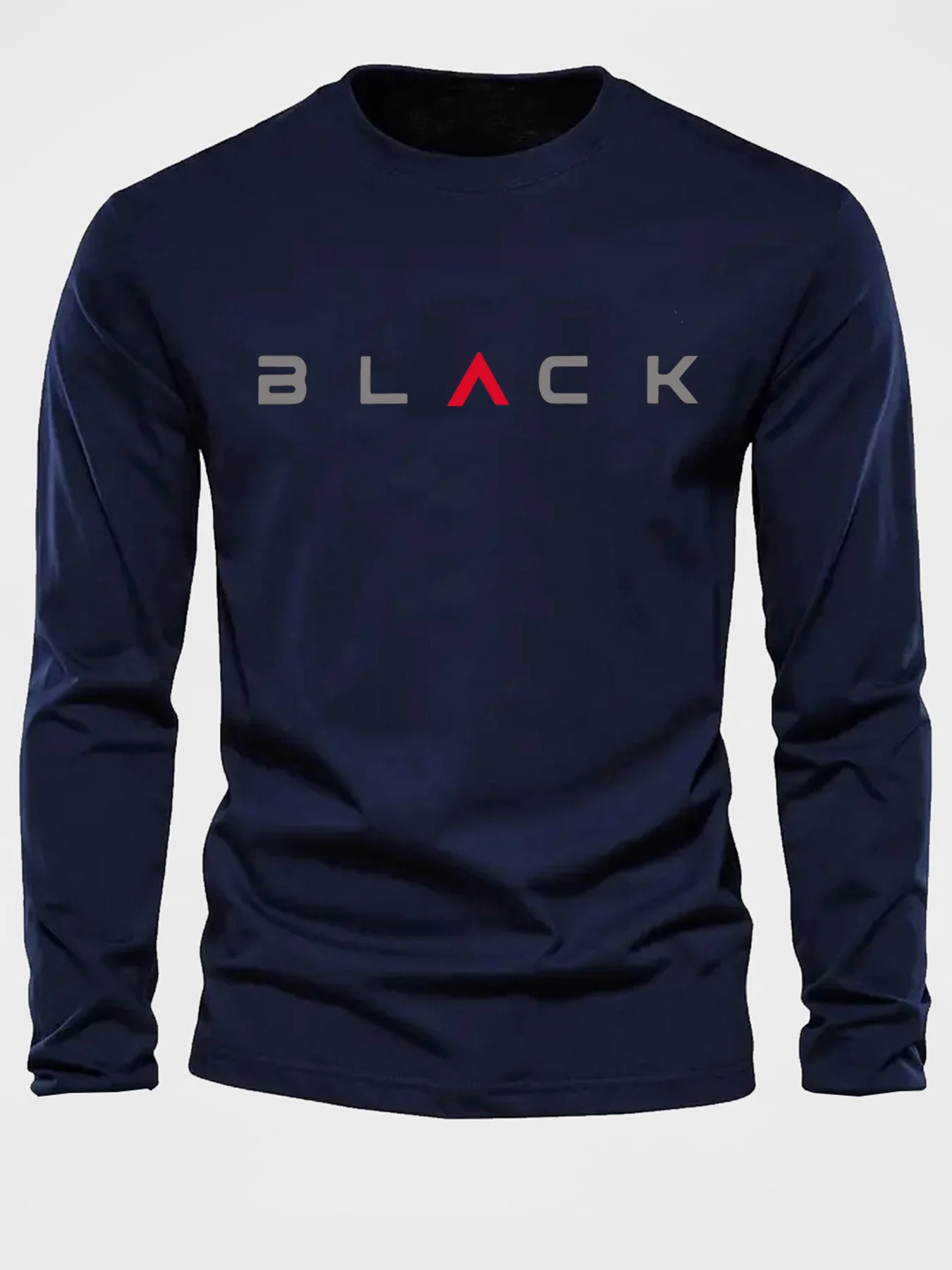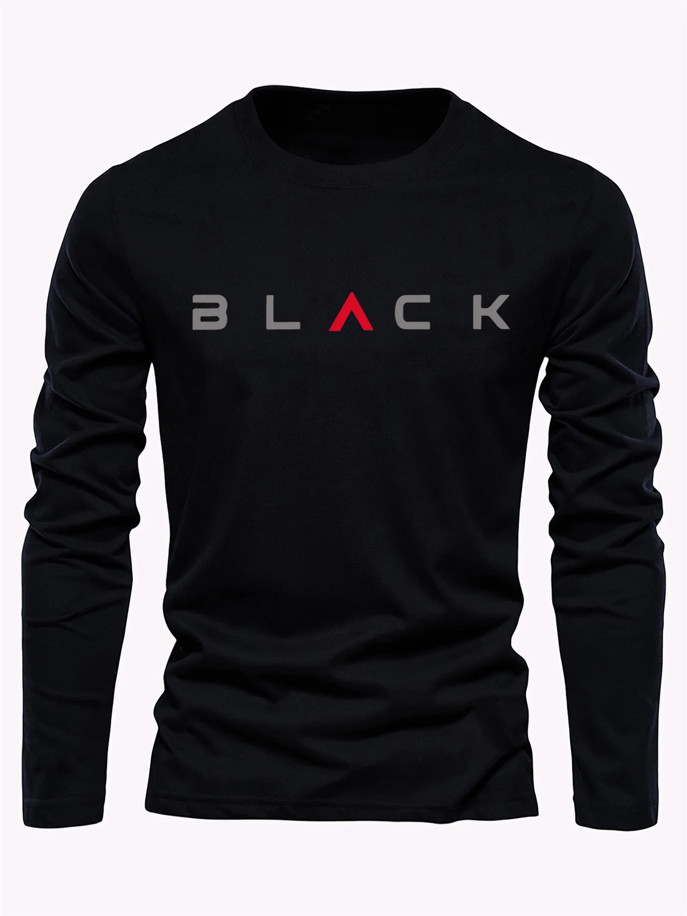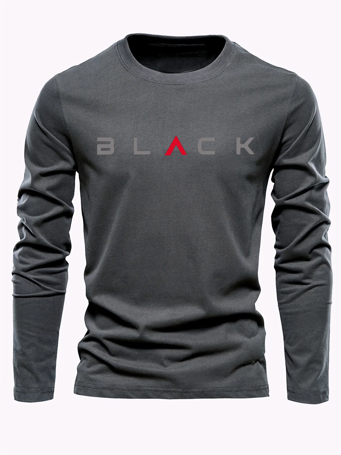 Men’s 100% pure cotton loose fit plus size comfortable casual sports BLACK letter printed round neck long sleeved T-shirt top