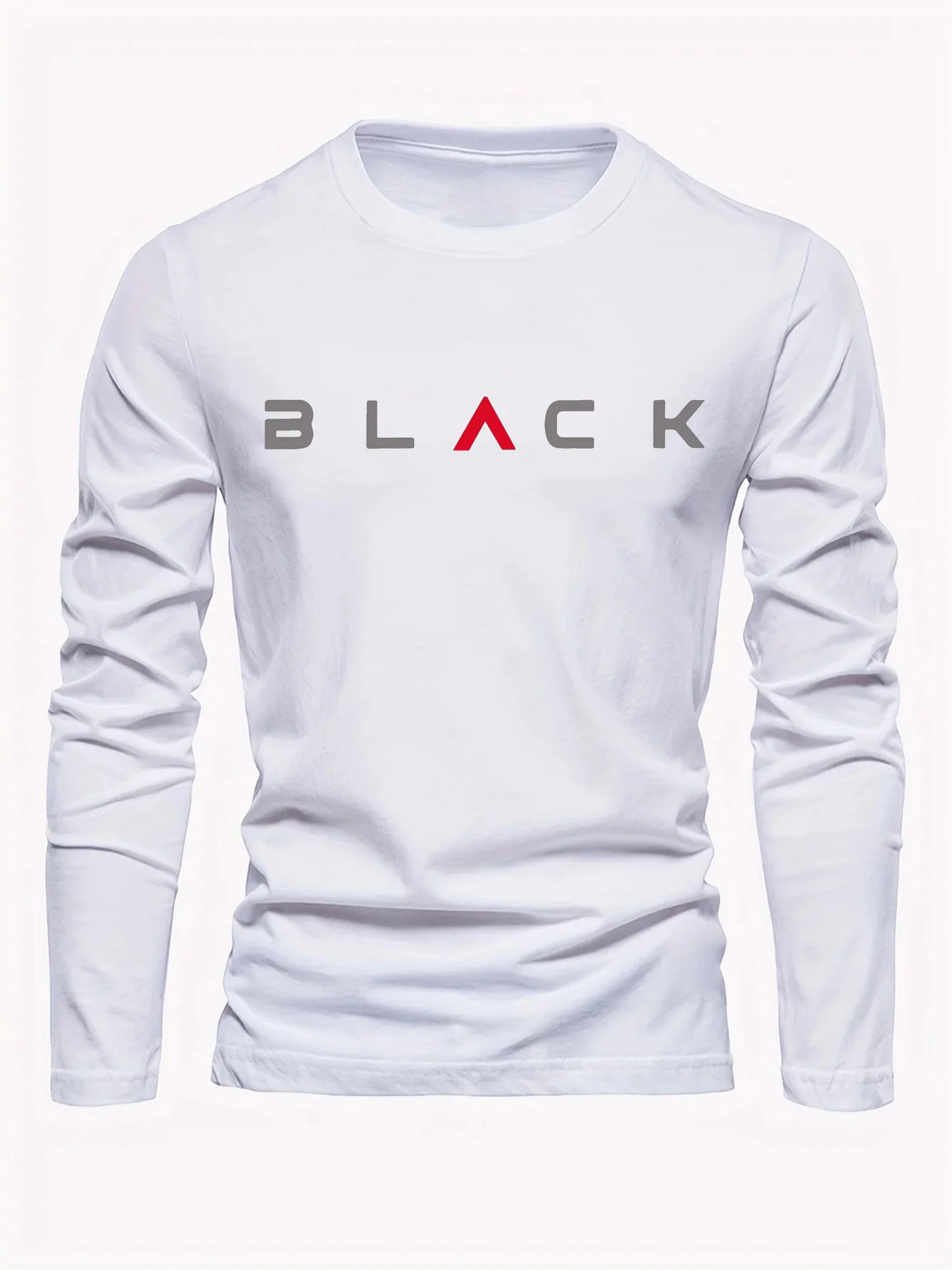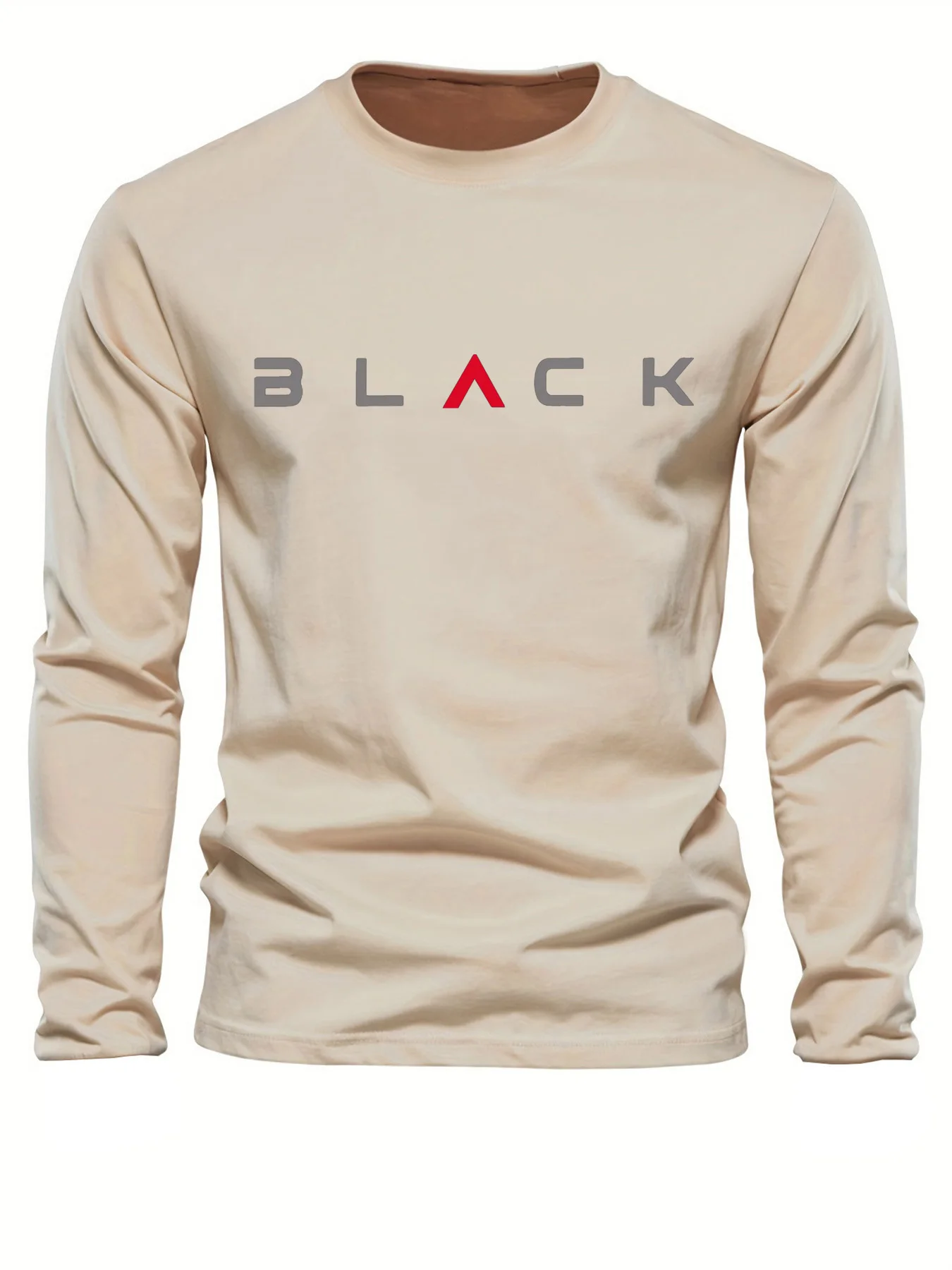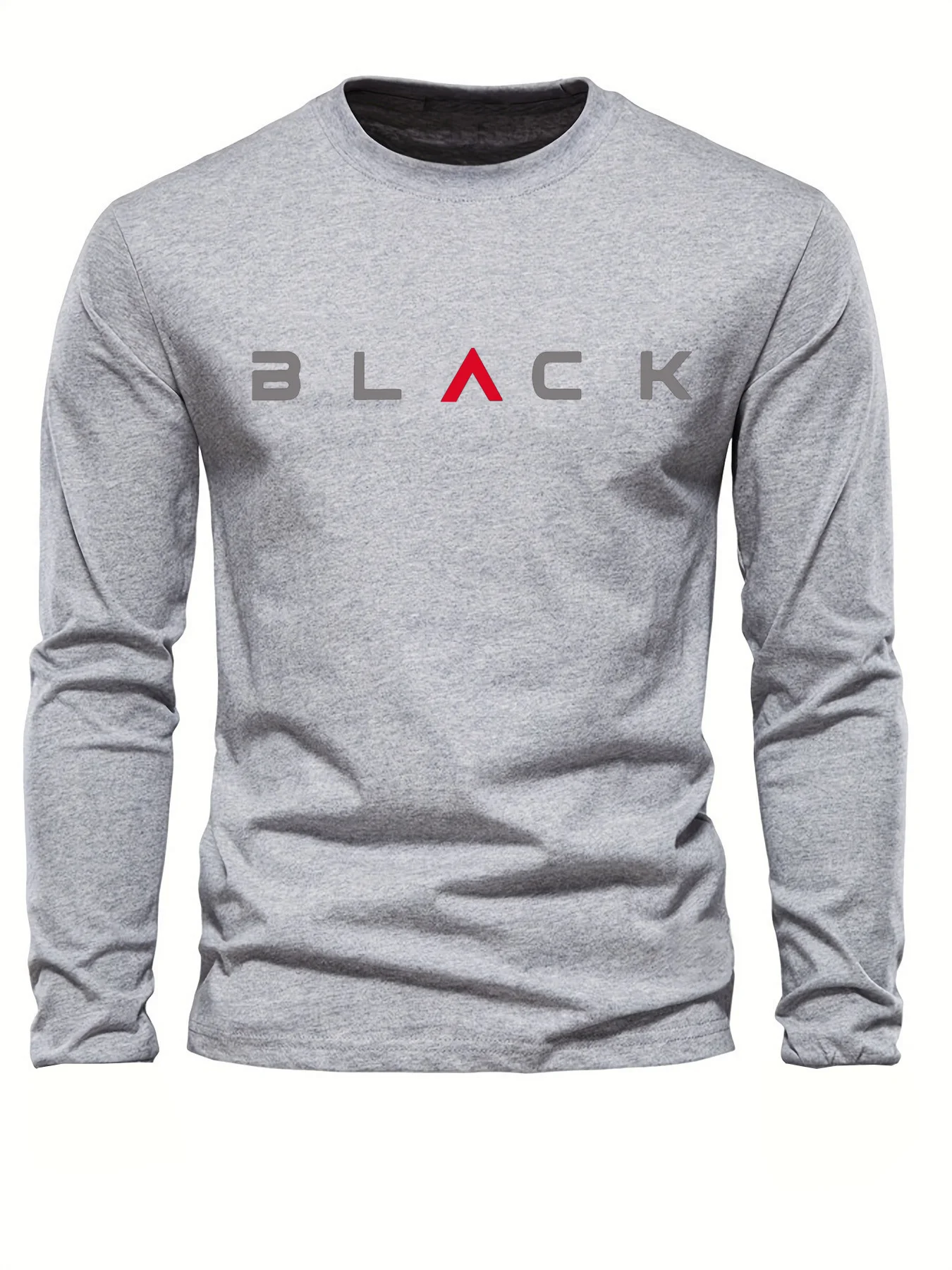 Men’s 100% pure cotton loose fit plus size comfortable casual sports BLACK letter printed round neck long sleeved T-shirt top
